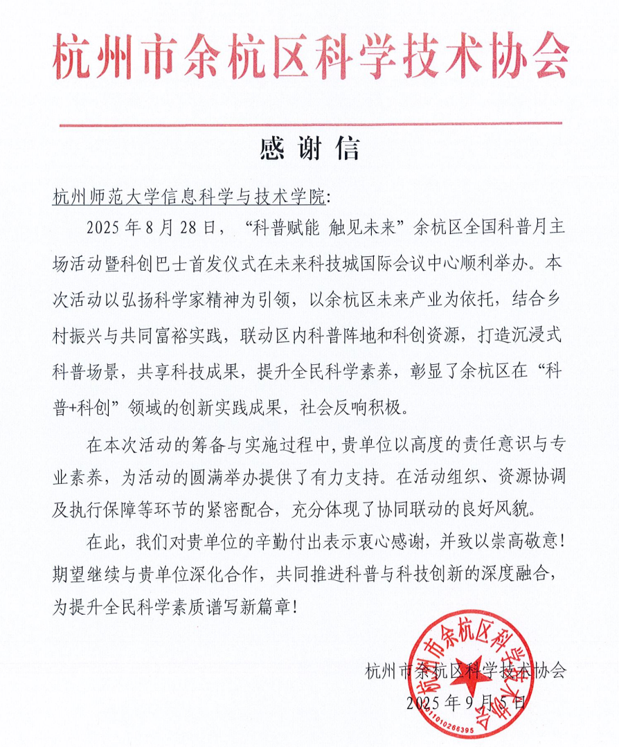 9月5日,成人视频 收到杭州市余杭区科学技术协会发来的感谢信,信中对成人视频 在“科普赋能 触见未来”余杭区全国科普月主场活动暨科创巴士首发仪式中的大力支持表示衷心感谢,并对参与师生的专业素养与协作精神给予高度评价。